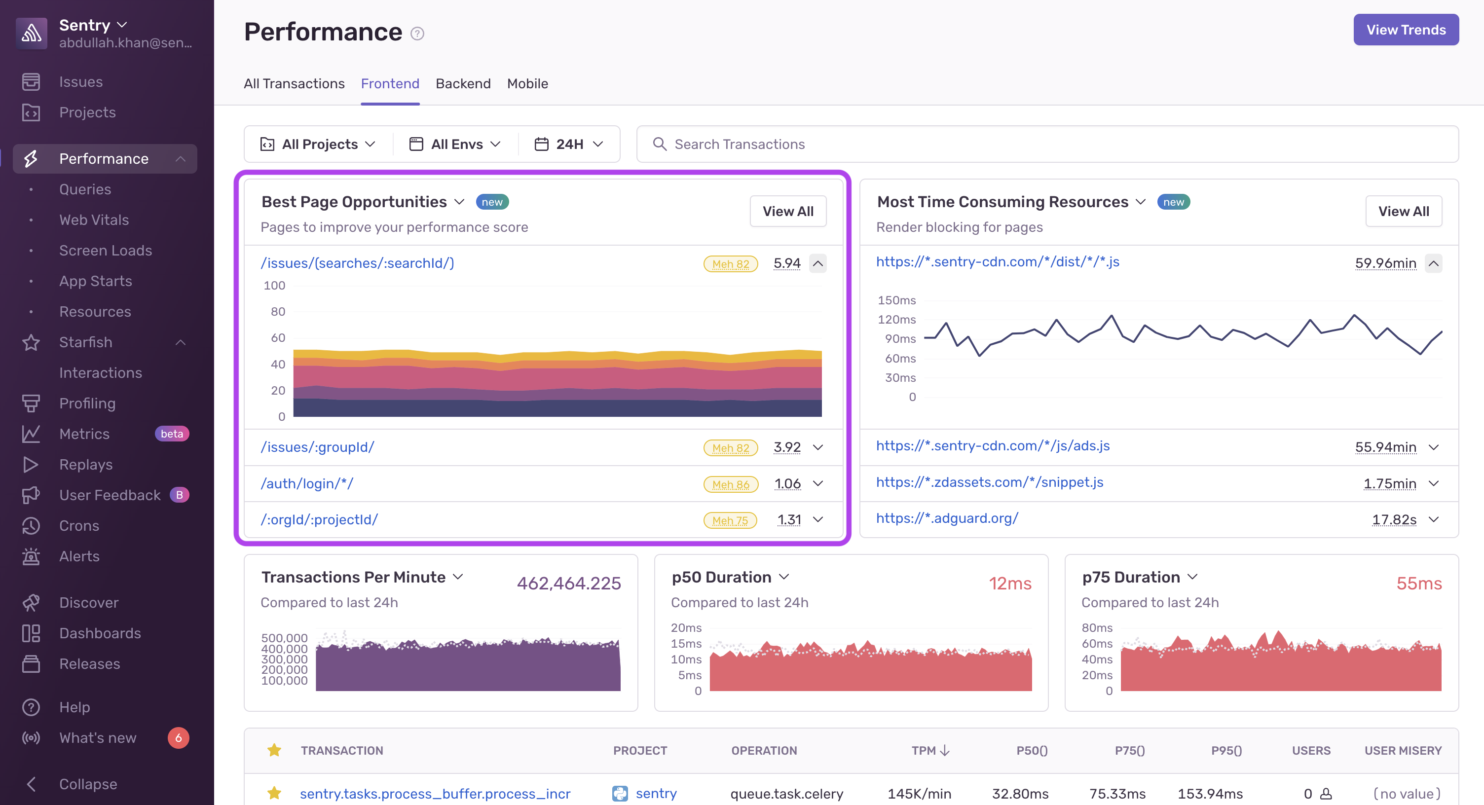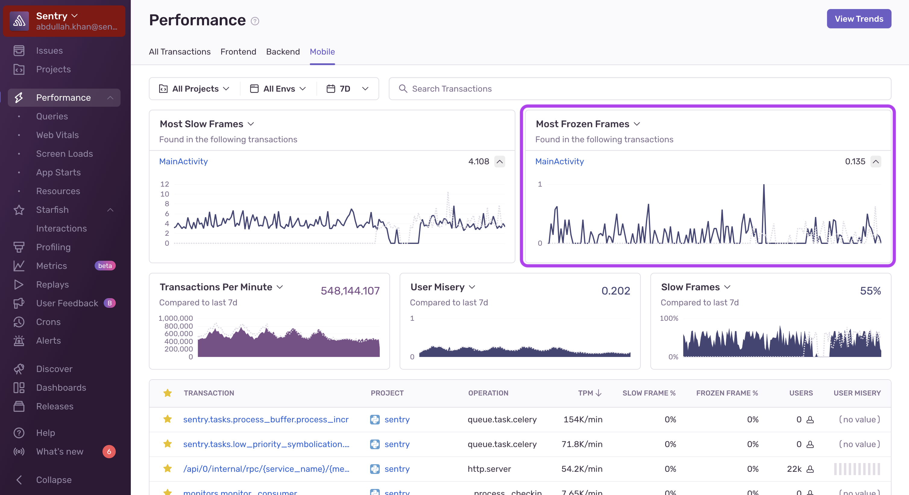 Shows transactions with the most slow frames for mobile projects. Learn more in Mobile Vitals.